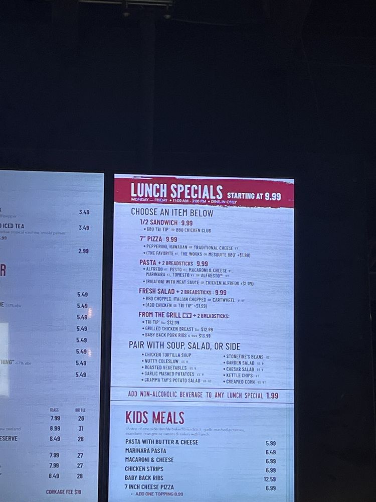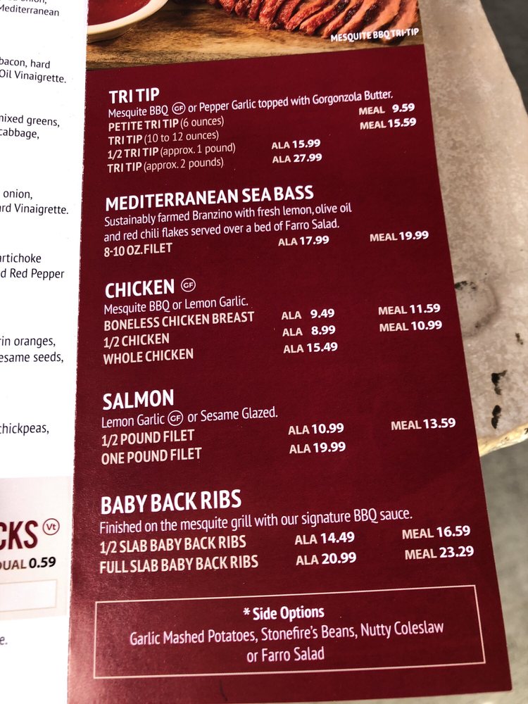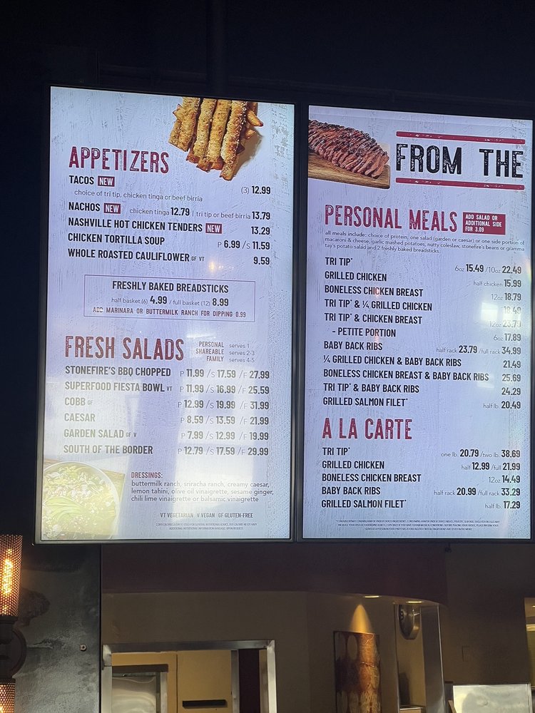 Include choice of protein, one salad (garden or Caesar), or one side portion of macaroni & cheese, garlic mashed potatoes, nutty coleslaw, Stonefire's beans or gramma tay's potato salad and freshly baked breadsticks.